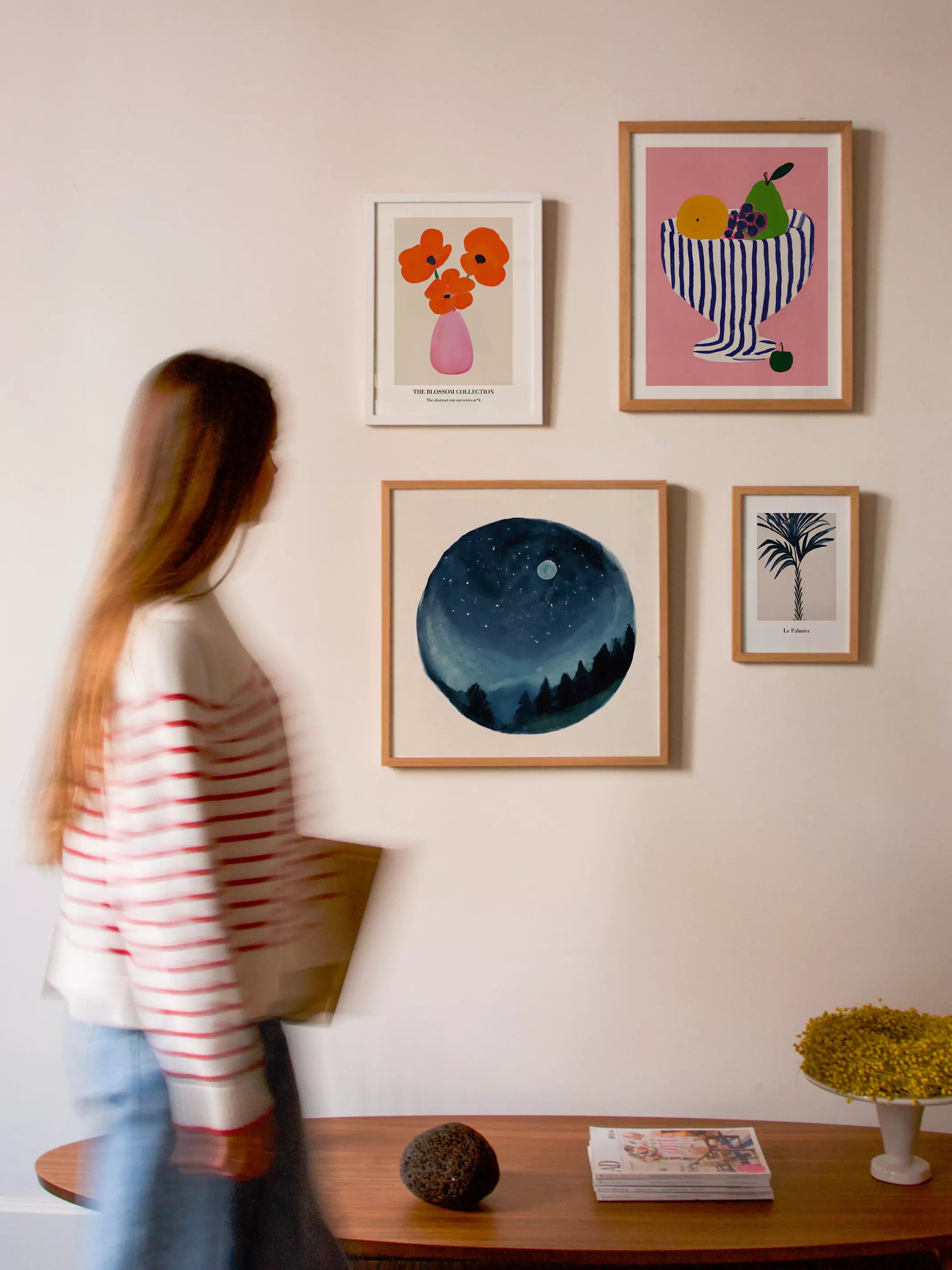 El pòster "Luna Blava" , creat per Merel Takken , una il·lustració en aquarel·la que captura la bellesa del cel estrellat sobre un bosc serè. El disseny minimalista i els tons profunds de blau la converteixen en una peça perfecta per decorar dormitoris, sales d'estar o espais de meditació.