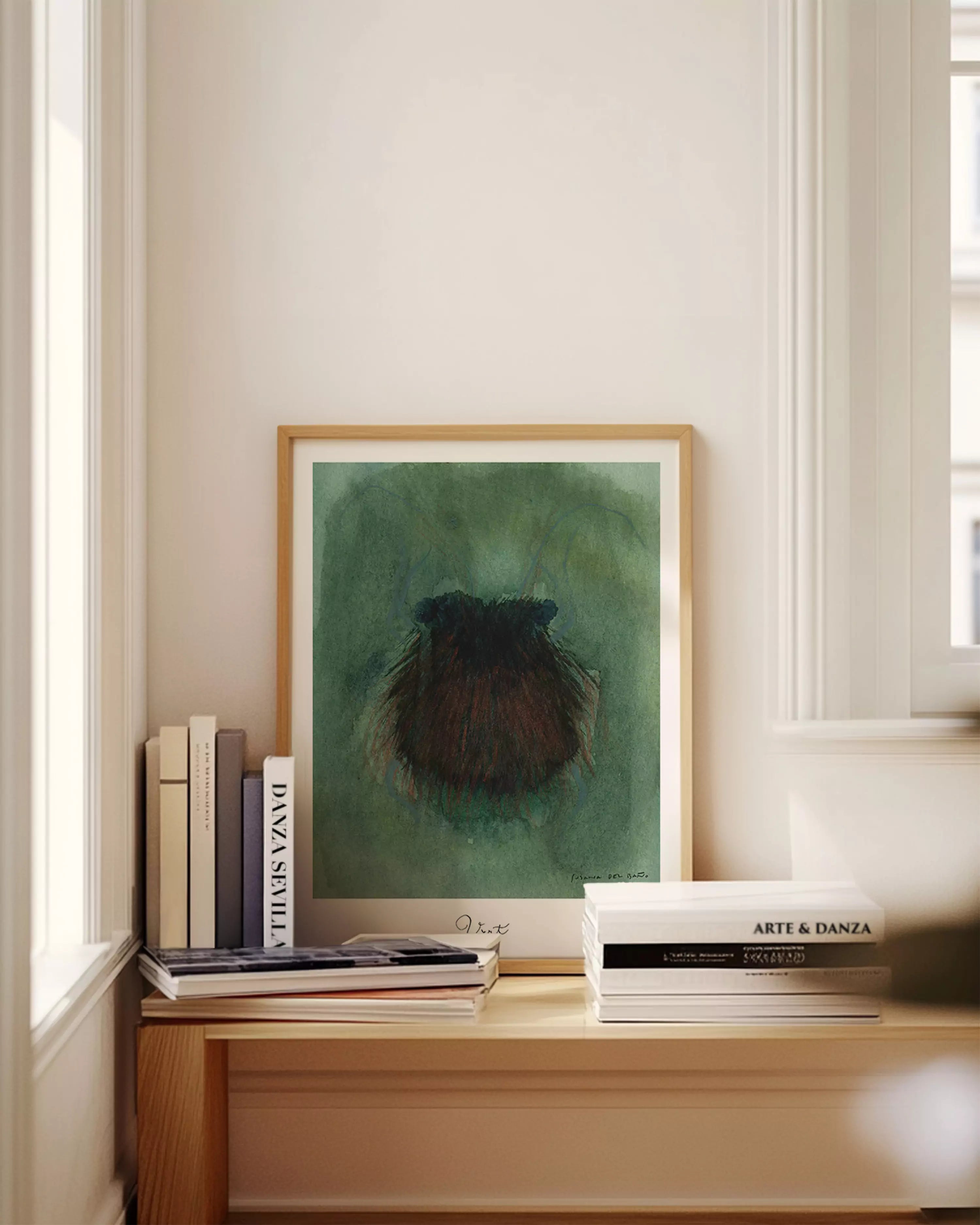El póster “Vert” combina un fondo color verde con el insecto en tonos carbón, generando transparencias delicadas que parecen flotar sobre el papel.