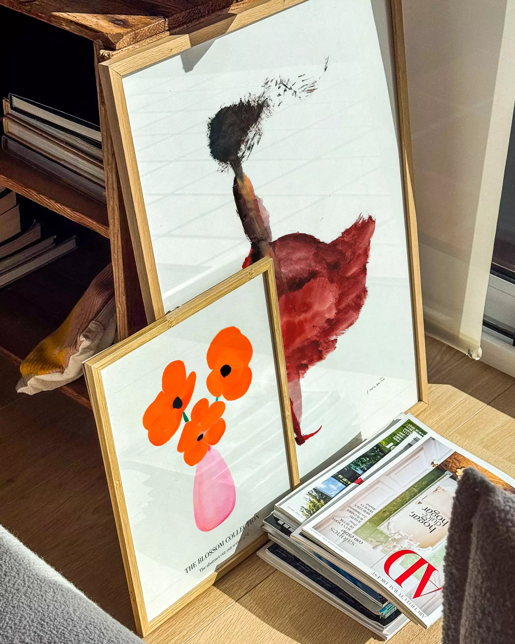 Lámina artística minimalista  creado por Merel Takken con tres flores naranjas en un jarrón rosa. Diseño moderno y abstracto en tonos cálidos, perfecto para una decoración fresca y llamativa.