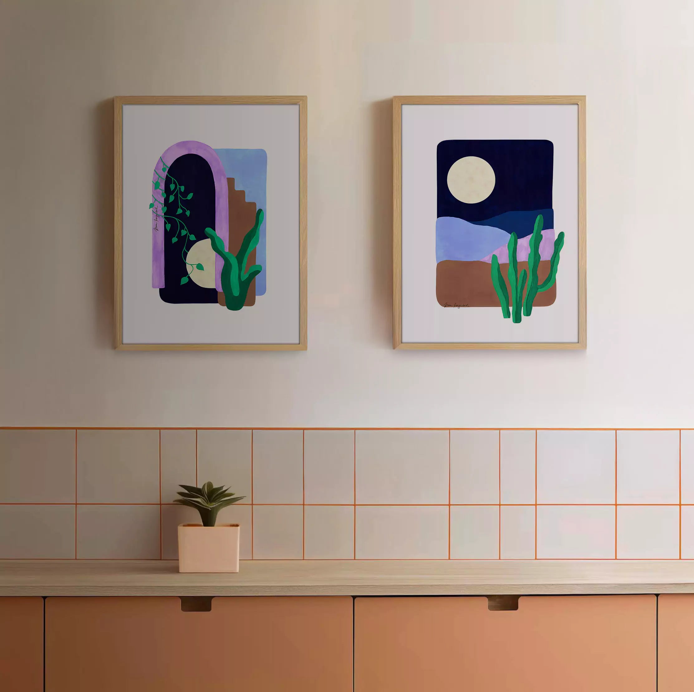Este póster artístico captura la esencia de Mallorca en una escena nocturna con una luna llena que ilumina montañas onduladas y vegetación autóctona, como euforbias. Perfecto para decorar tu hogar con un toque mediterráneo que evoca serenidad y belleza natural.