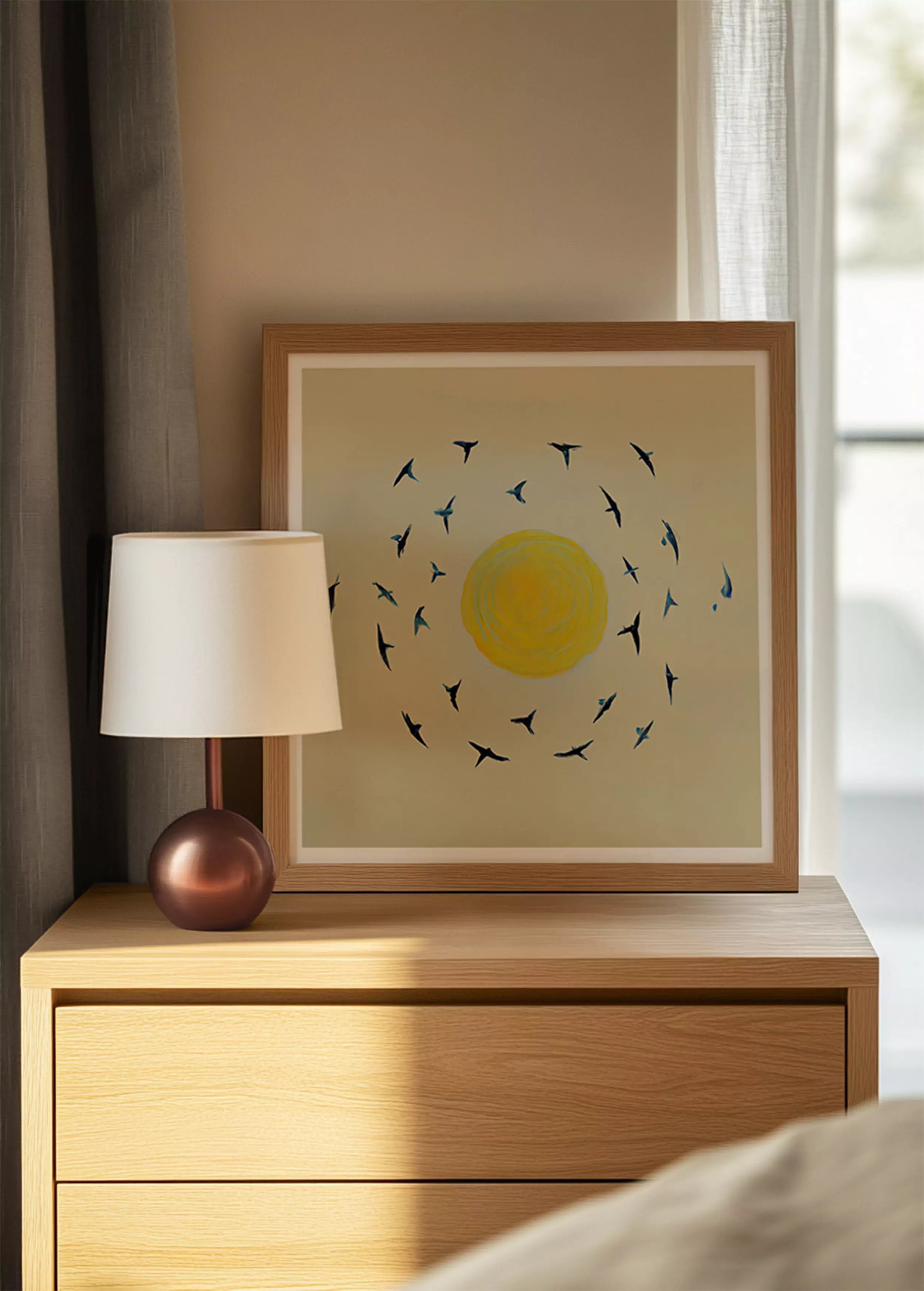 El póster creado por Merel Takken, presenta un sol radiante en amarillo que ilumina el centro de esta lámina artística, el espiral le da textura y calidez. A su alrededor, un conjunto de aves en vuelo en una silueta oscura con toques de azul revolotea en armonía, generando una sensación de libertad, movimiento y equilibrio visual. La singularidad del conjunto lo convierte en una pieza idónea para la decoración contemporánea y minimalista. Una obra llena de luz, naturaleza y energía positiva, perfecta para aportar un toque de tranquilidad a cualquier espacio.