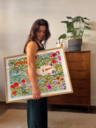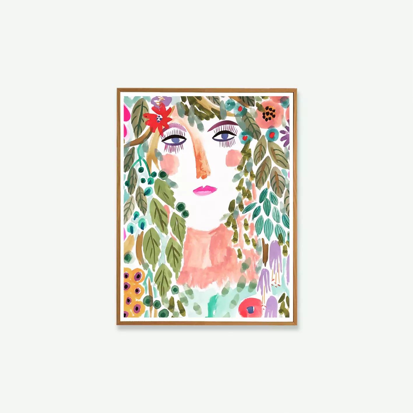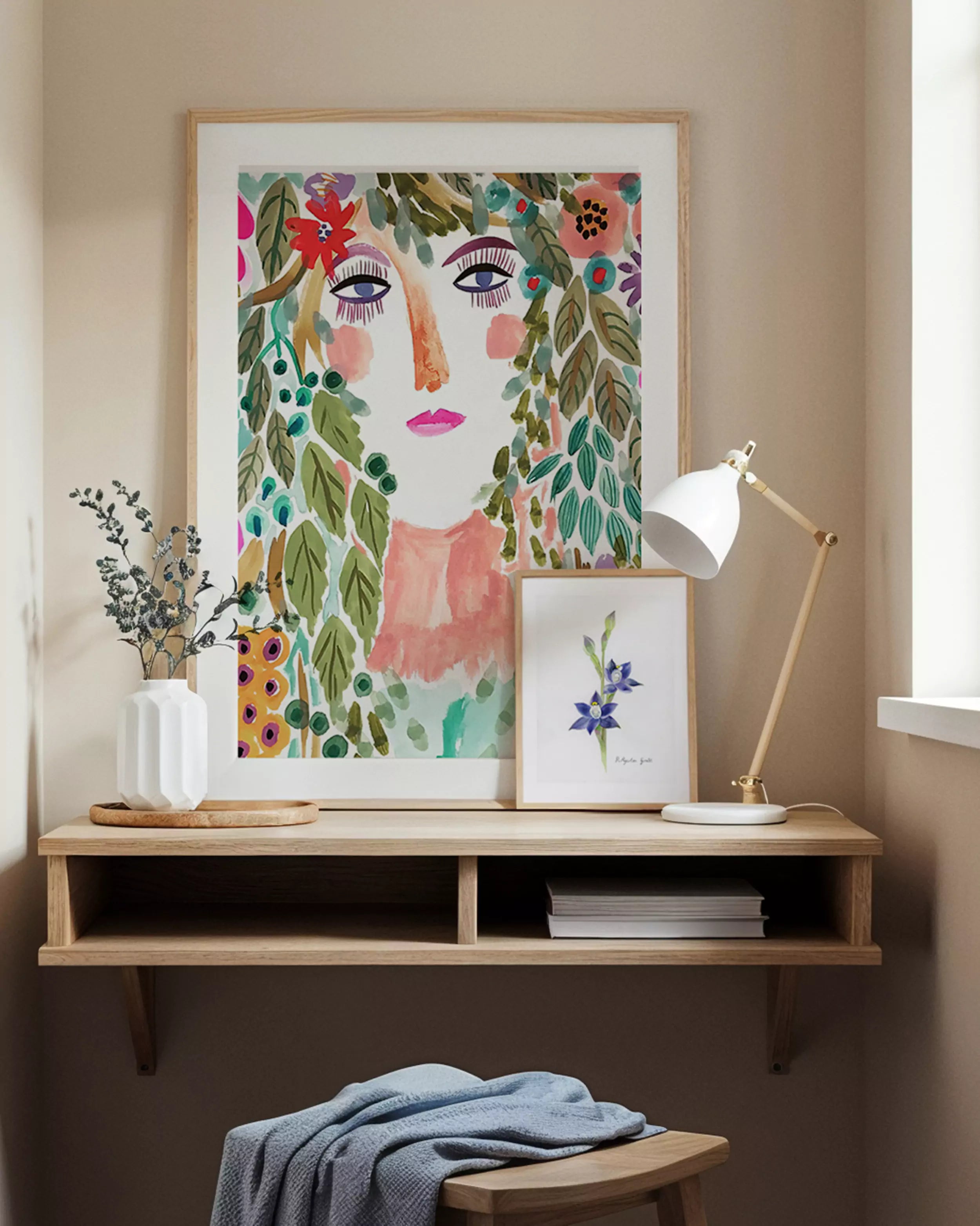 Una obra en acuarela curada por Susana del Baño suave de colores que celebra la conexión entre lo humano y la naturaleza. El retrato femenino se envuelve en una fauna de flores silvestres que aportan frescura y armonía.