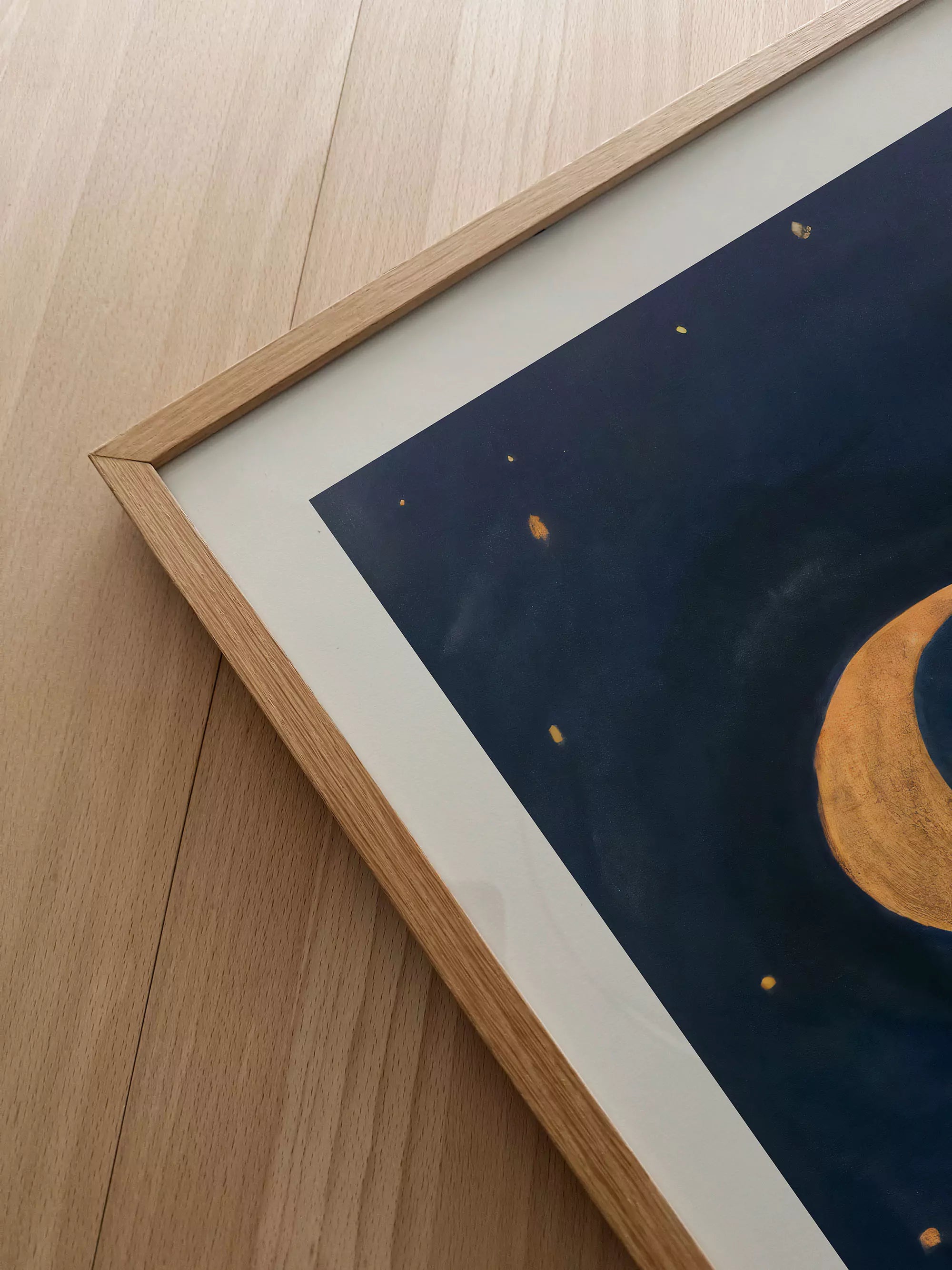 Póster artístico minimalista con luna creciente – lámina decorativa celestial