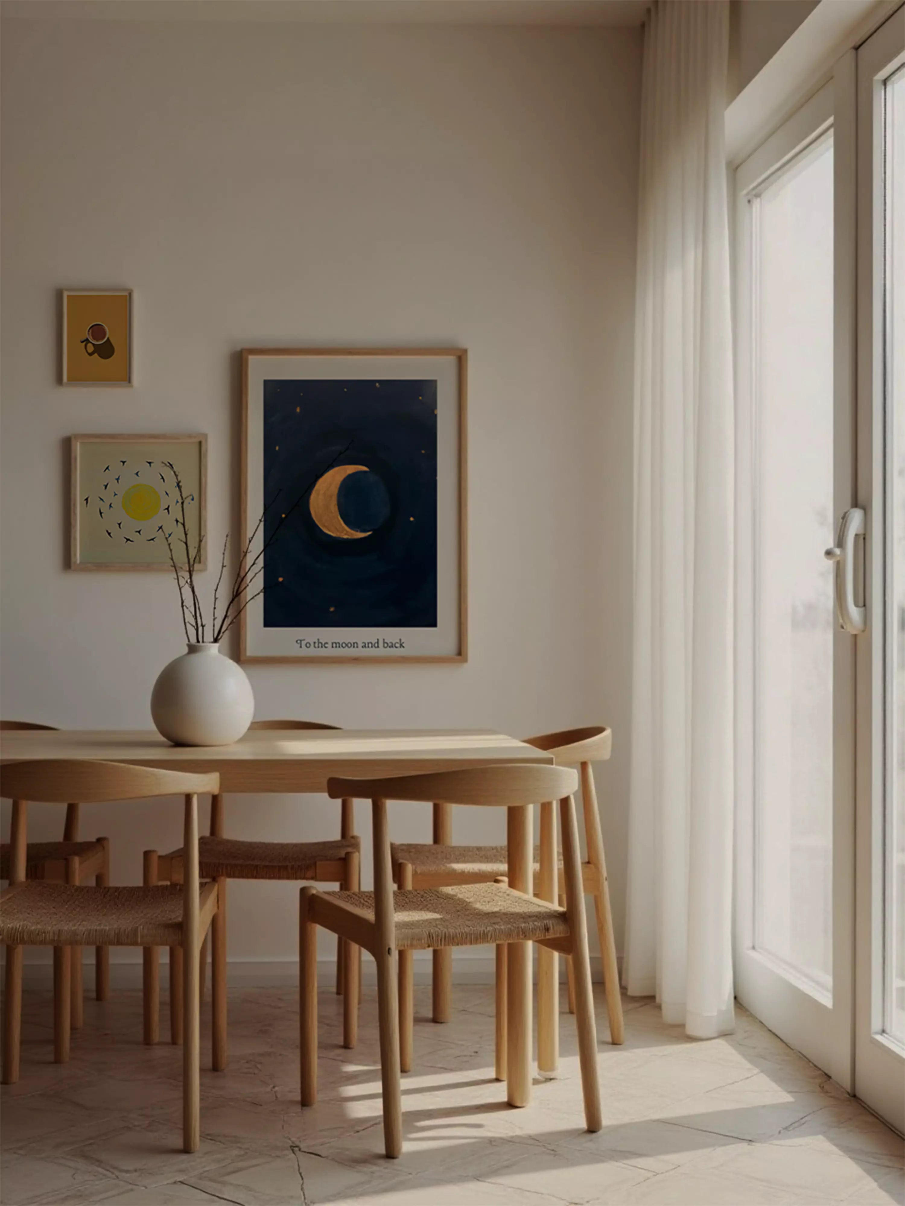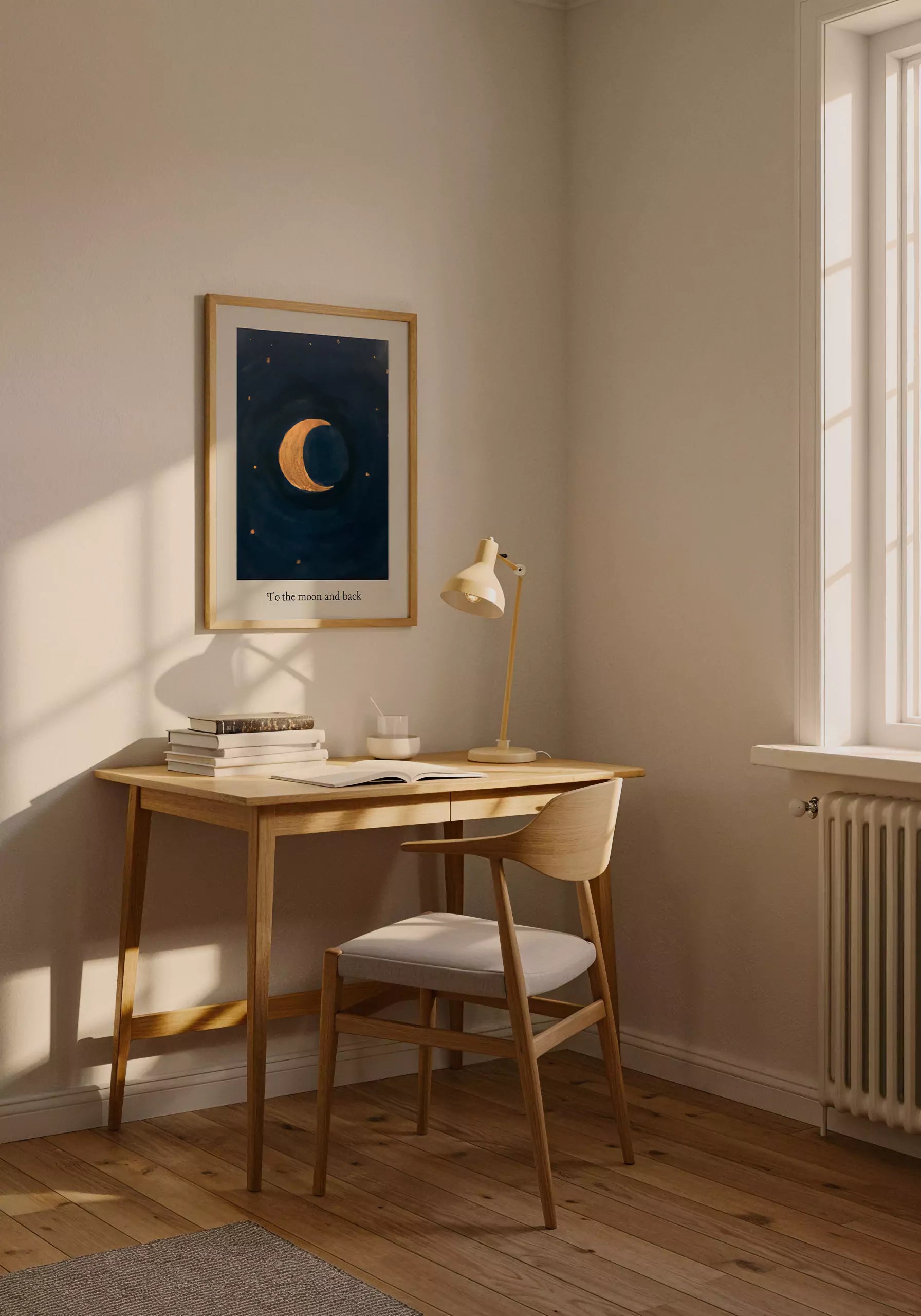 Este póster elegante y minimalista creado por Merel Takken muestra una luna creciente que brilla suavemente sobre un cielo azul medianoche profundo. A su alrededor, pequeñas motas doradas, similares a estrellas lejanas, crean una atmósfera mágica y serena. La frase “To the moon and back” aparece impresa con delicadeza debajo de la ilustración, aportando un toque emocional y entrañable.
