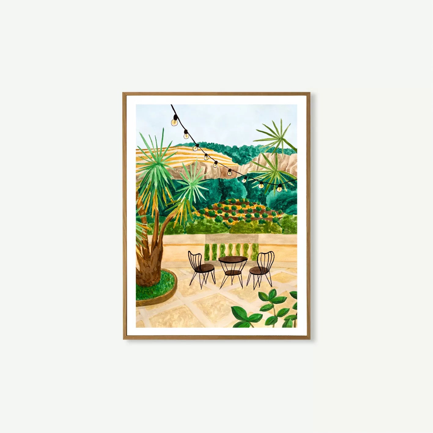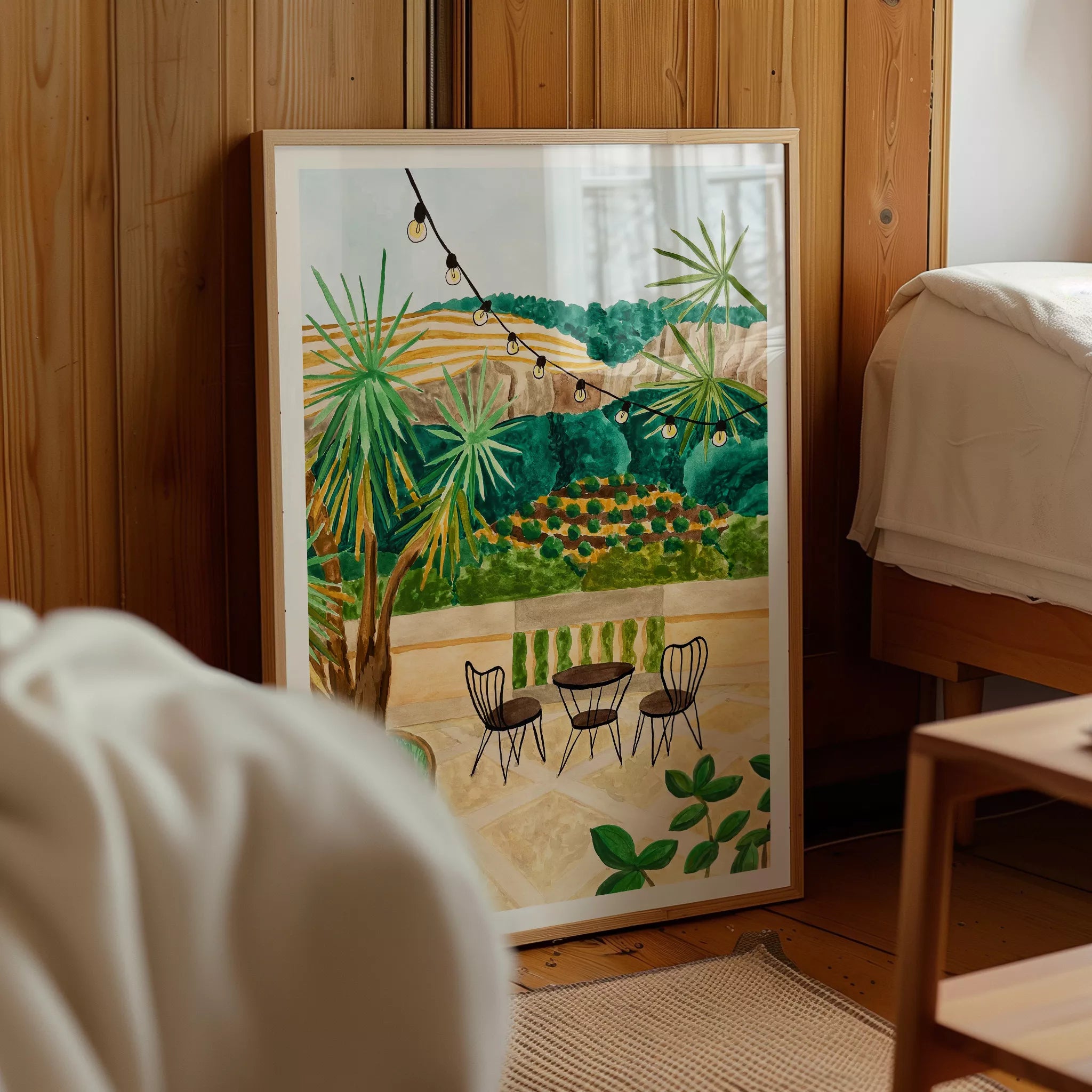 Una ilustración que invita a relajarse, respirar y dejarse llevar por la belleza del Mediterráneo. Perfecta para decorar salones, comedores, despachos o espacios donde quieras añadir luz, frescura y un ambiente natural.