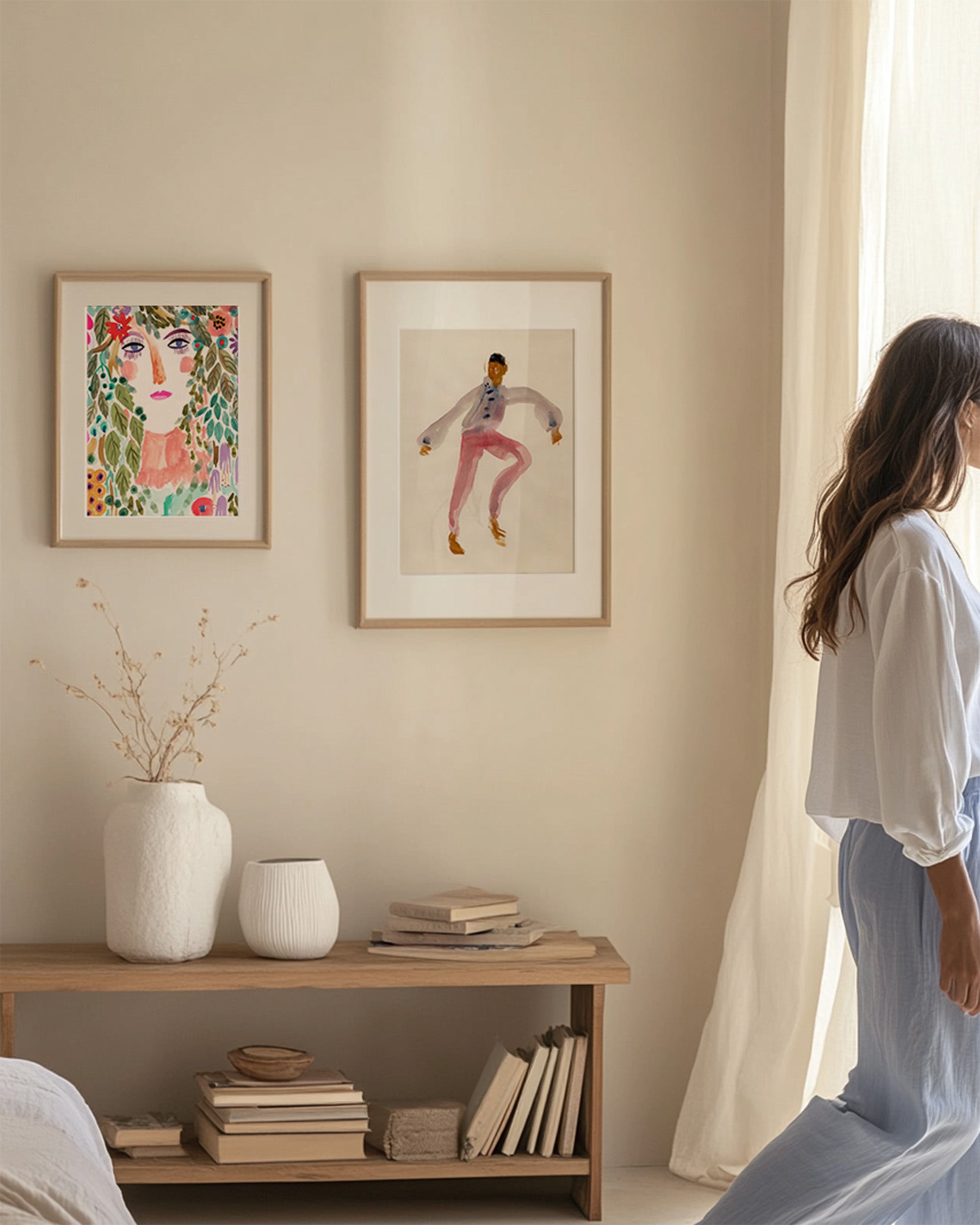 "Este póster en acuarela presenta una figura en movimiento, capturada con trazos sueltos y expresivos que aportan vida y ligereza. La paleta de colores suaves y el estilo minimalista lo convierten en una pieza perfecta para interiores luminosos y tranquilos. Ideal para amantes del arte contemporáneo, el diseño sereno y la estética mediterránea. Imprime calma y elegancia en cualquier rincón de tu hogar."